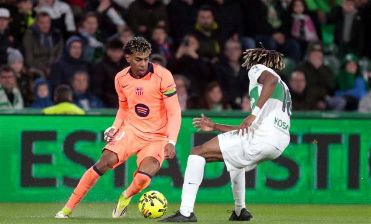北京时间2026年2月1日凌晨,西甲第22轮,升班马埃尔切在主场迎来了卫冕冠军巴塞罗那的挑战。 比赛仅仅开始了5分钟,巴萨就给了主队球迷当头一棒。 一次流畅的团队配合后,中场核心奥尔莫送出一记手术刀般的直塞球,皮球精准地穿越了防线。 年仅小将亚马尔心领神会,高速插上形成单刀。 面对出击的门将,亚马尔展现出了超越年龄的冷静,他轻巧地一扣,晃倒了守门员,随后轻松推射空门得手。 这个进球,让亚马尔追平了由姆巴佩保持的纪录,成为了欧洲五大联赛历史上最年轻的连续三场进球者之一。 巴萨取得了梦幻般的开局。